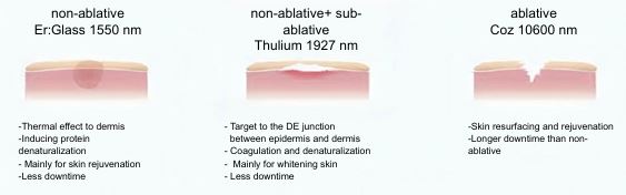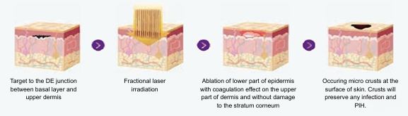 Hemligheten bakom att kunna behandla så många olika indikationer är möjligheten att på ett enkelt sätt ställa in rätt energi och rätt pulsvidd vilket gör att man når epidermis och skickar rätt värme för att få en effekt utan att göra stora skador på huden i övrigt. Här nedan ses hud i genomskärning och förloppet från obehandlad hud till hud som behandlats och hur den läker: